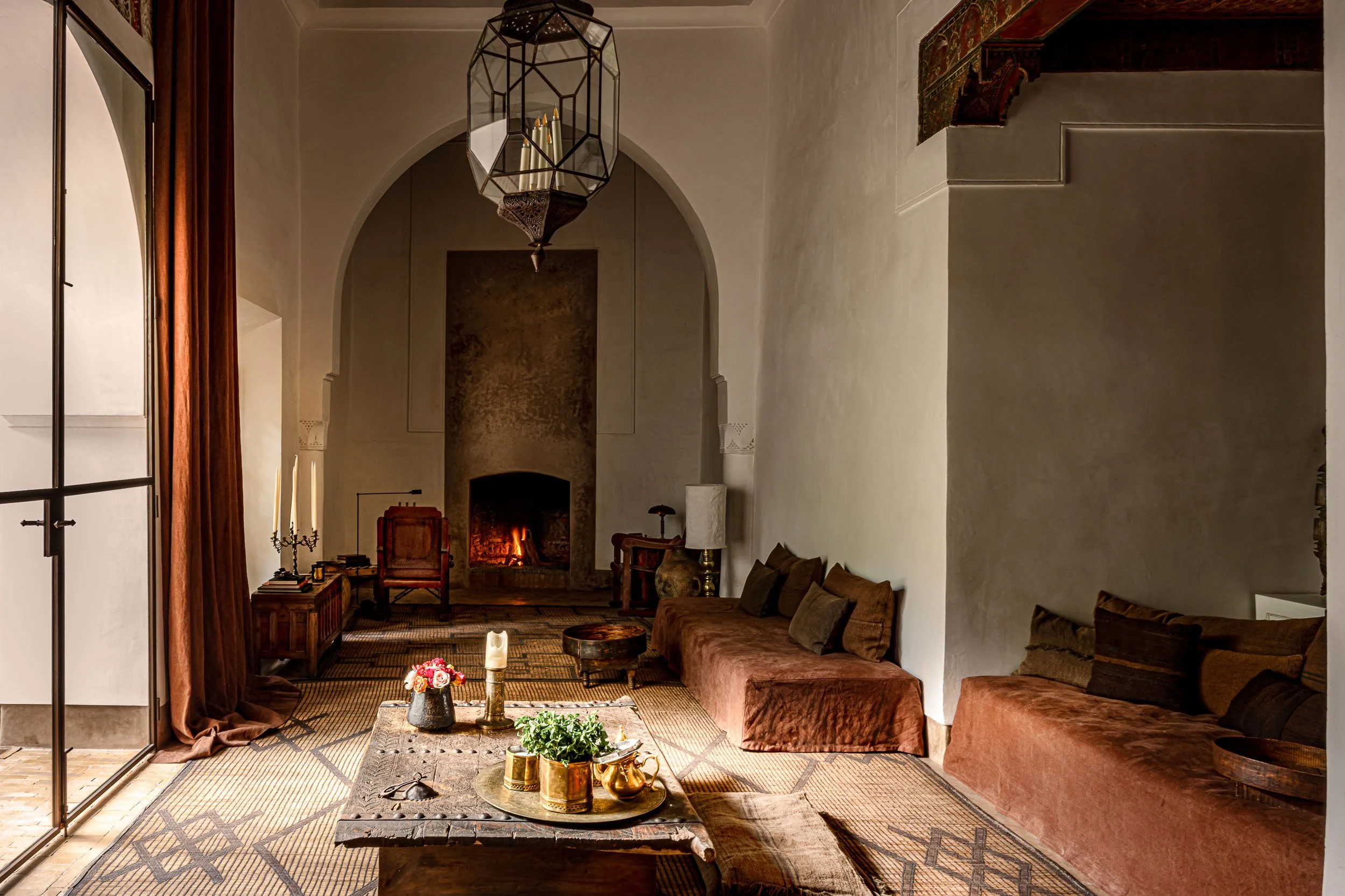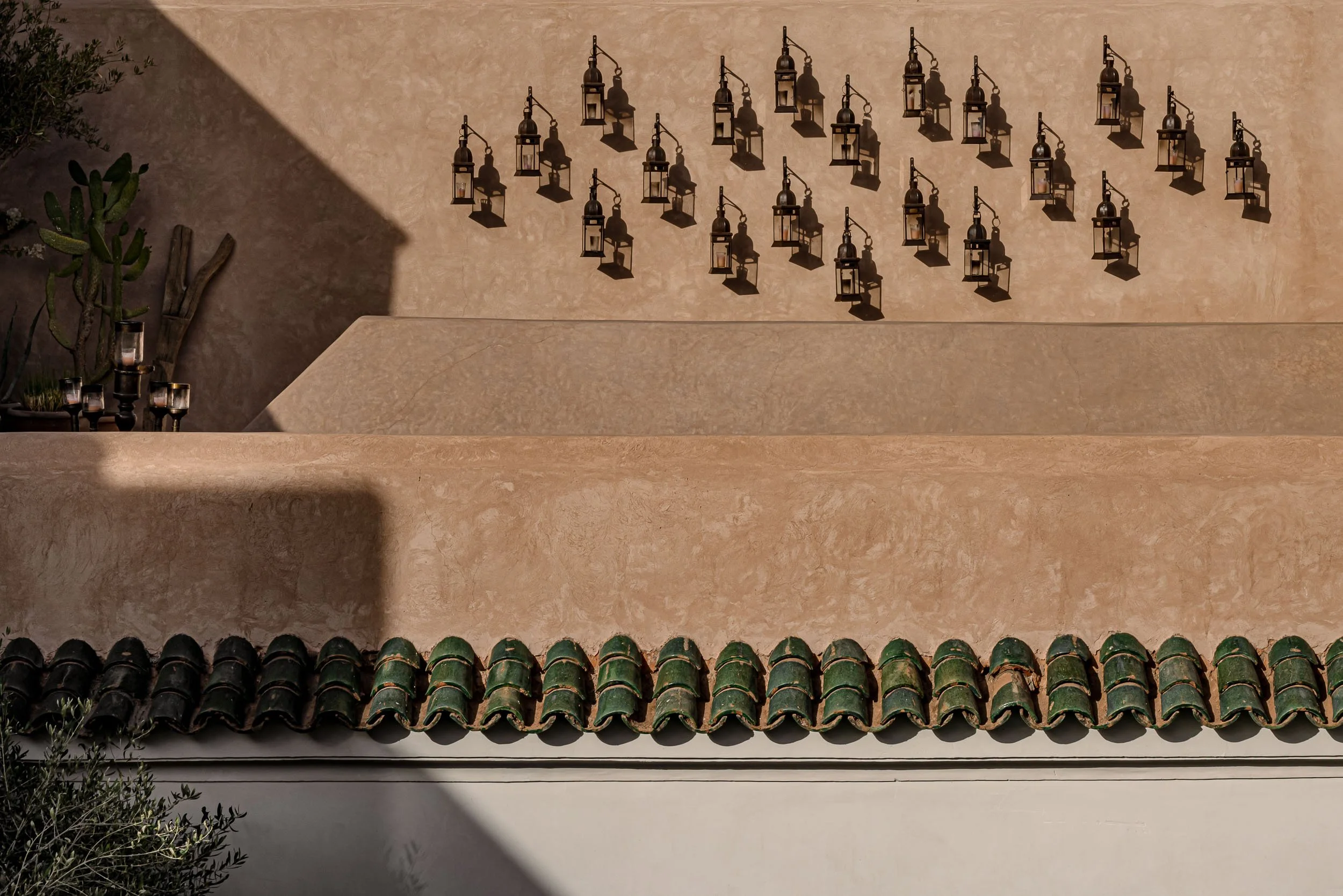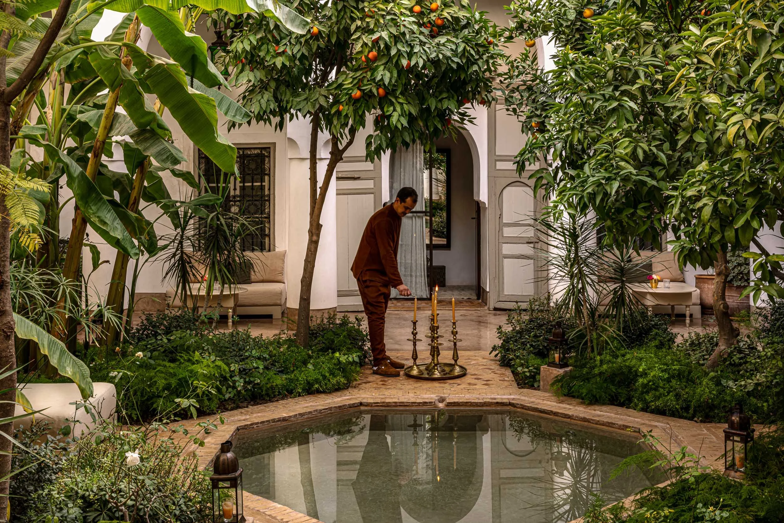 Ce Riad Berbère condense à la fois le meilleur de la ville et du pays, comme si on pouvait tout encapsuler dans la sérénité de son patio verdoyant, la somptuosité de son salon tendu de rouge ou la fraîcheur de ses toits-terrasses où s’invitent un ballet de lanternes multipliants leurs silhouettes sous l’effet de la lumière. Si la prodigalité de ces dernières s’opposerait presque à l’ascèse relative des chambres et suites conçues comme de véritables cocons aux tonalités douces et tendus de voilages éthérés, les unes comme les autres battent la mesure d’un temps qu’on voudrait suspendre et qui nous vient de loin. Chaque moment de la journée au Riad Berbère se pare d’une couleur, d’une lumière, d’un plaisir empli de douceur et d’une lenteur retrouvés. Une partie d’échecs à la fenêtre du salon, une lecture sous la colonnade, une sieste aux abords du bassin, un massage suivi d’un gommage au savon noir sous les vapeurs d’agrumes, un drink sous les étoiles ou une verveine à la lueur des derniers feux des bougies, donnant à ce Riad des airs de palais des mille et une nuits le soir venu, nous touchent en plein cœur.