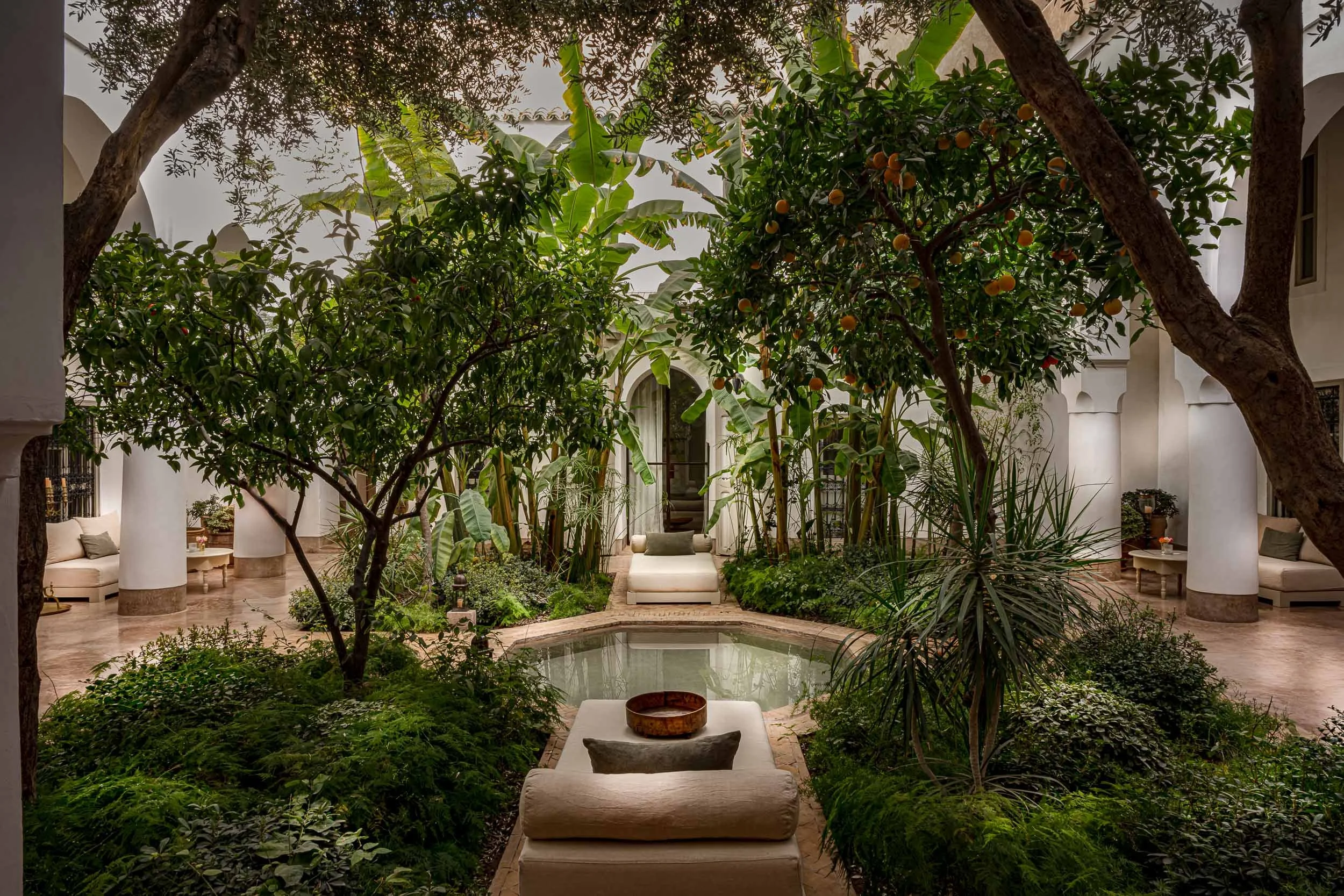 « Bâti au XIIIème siècle, ce Riad aux allures de palais déploie ses charmes à l’ombre de ses arches blanches, d’une cour séculaire plantée d’orangers ployant sous leurs fruits et d’un bassin octogonal invitant à la détente »