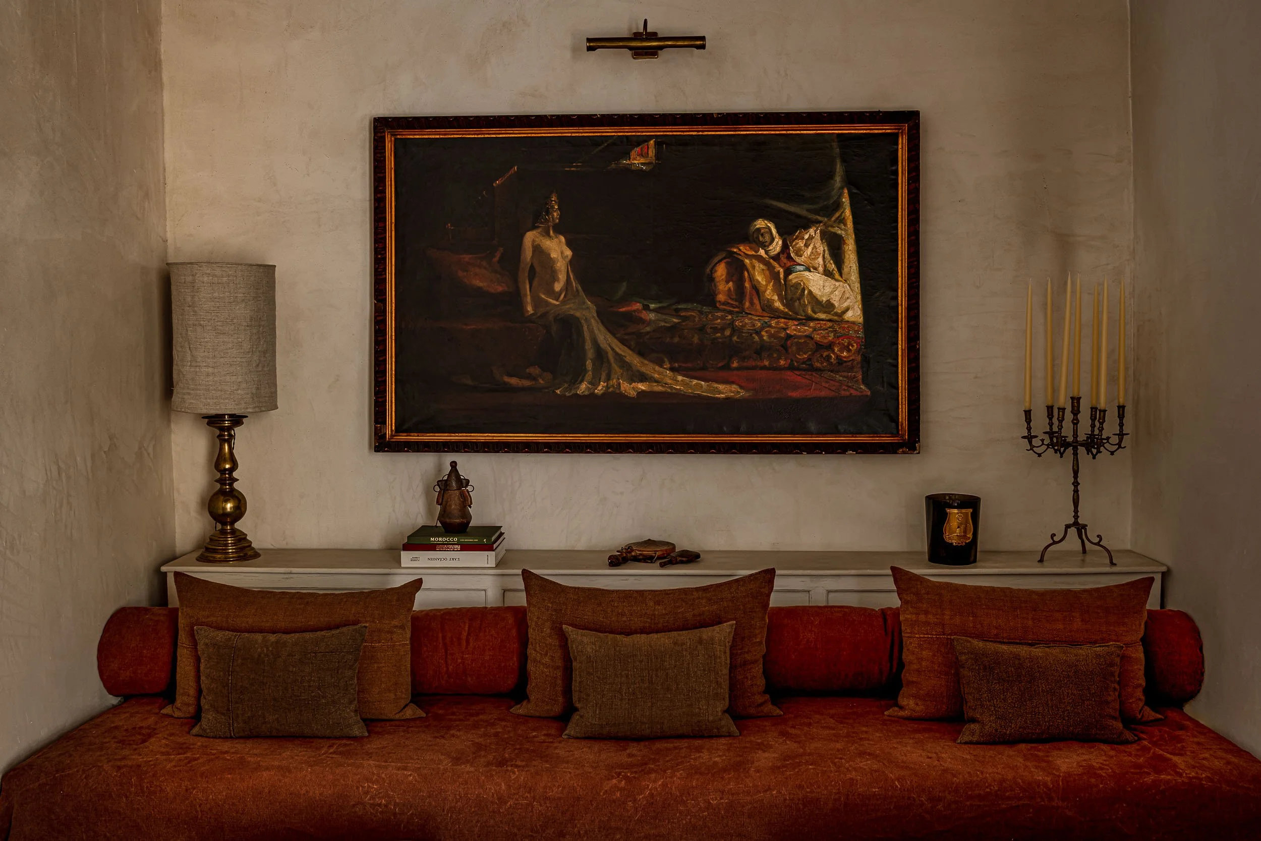 Il nous rappelle les riches heures malheureusement perdues d’un Ksar Char Bagh dans la Palmeraie tout aussi habile à mixer sophistication et simplicité, tradition et modernité comme ombre et lumière dans une recherche de poésie de chaque instant. Dans chaque recoin du Riad, l’art s’invite au détour de pièces fortes comme de somptueuses peintures orientalistes et de détails plus anodins dans une palette volontairement réduite de blanc, ocre et terre parant dessus de lits, housses de chaises et de canapés ou uniformes d’un personnel, disons-le d’emblée remarquable.